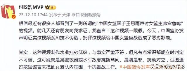 北京时间12月20日,中国篮协发布严正声明,针对中国女篮教练员和运动员的不实信息与恶意谣言,甚至利用AI技术伪造音视频,侵权造假、进行人身侮辱、散布虚假信息,挑动对立赚取流量。中国篮球协会坚决反对歪曲事实、造谣、抹黑、污蔑、煽动情绪对立等无底线博流量行为。对于恶意损害中国女篮成员及团队形象的行为,中国篮球协会将保留通过法律途径追究其法律责任的权利。其中,最为值得外界关注的是涉及到AI造假王思雨声讨宫鲁鸣的合成视频。涉及到训练不公、教练偏袒新人、奖金分配问题等等问题,一度在网络上引起了很高的热议。媒体人付政浩发文点评说道“这种视频制作水准拙劣低级,与事实严重不符,但凡有点常识都能立时判定不可信。这可能就是某些饭圈或水军故意挑拨离间、混淆是非、挑动对立,试图通过散播谣言来搅乱女篮队内氛围,干扰备战工作。”随后与球迷互动评论说道:“自今年以来,宫指导已经被水军编造谣言黑了好几次了。也不知道是谁这么有钱,雇佣水军天天黑”。该图片疑似AI生成而网络上一些以宫鲁鸣声音造谣的AI视频,确实是比较过分,尤其是第一人称的视角解读。宫鲁鸣时隔多年重返中国女篮主帅的位置,涉及到一些选人,以及亚洲杯成绩未能达到预期,一度在夏天引发比较大的争议。主要涉及争议大概如下:核心阵容基本以巴黎奥运会为主,除了征战海外联赛的李月汝外,国内女篮球员唯独少了李梦,对外宣称是有伤在身,身体状态达不到国家队标准。随后李梦发文回应颇有深意,连续感谢自己。宫鲁鸣在淘汰赛前点评日本女篮,我们希望她们(日本女篮)能够拿出上半场这样的干劲,不要像下半场那样无能表现引发外界的热议,但在半决赛,中国女篮防守崩盘,最终,不敌日本女篮无缘决赛,宫鲁鸣遭到很多球迷和媒体吐槽,认为他有轻敌的成分。